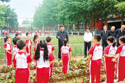 随后,习近平来到学生农场。这里是学生开展农业种植活动的实践场所,阳光下、田垄上,一排排绿油油的菜苗生机勃勃。孩子们拿着水桶、铲子、耙子、毛笔,为西红柿、黄瓜等浇水、松土、除草、授粉。习近平强调,很多知识和道理都来自劳动、来自生活。引导孩子们从小树立劳动观念,培养劳动习惯,提高劳动能力,有利于他们更好地学习知识。现在一些城里的孩子接触农村、接触大自然少,不光“四体不勤”,而且“五谷不分”,对吃的是什么、从哪里来的、怎么来的都不知道,更体会不到“谁知盘中餐,粒粒皆辛苦”。他对同学们说,认识大自然,首先要从认识身边的植物开始。同学们栽培的各种植物,虽然书本上都有介绍,但大家亲手种、亲自培育、跟踪观察,收获肯定是不一样的。希望同学们从“学农”中感受到农作的艰辛和农民的不易,从小养成热爱劳动、珍爱粮食、尊重自然的良好习惯,为建设美丽中国作贡献。新时代生态文明建设要从娃娃抓起,通过生动活泼的劳动体验课程,让孩子亲自动手、亲身体验、自我感悟,让“绿水青山就是金山银山”的理念早早植入孩子的心灵。