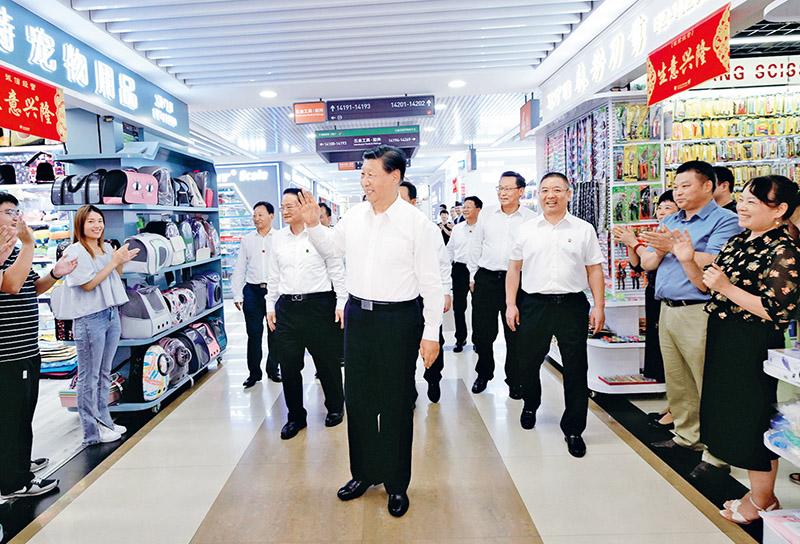 2023年9月20日至21日,中共中央总书记、国家主席、中央军委主席习近平在浙江考察。这是20日上午,习近平在义乌国际商贸城考察时,同商户亲切交流。 新华社记者 李学仁/摄