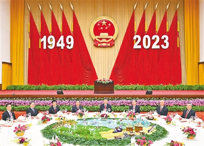 人民大会堂宴会厅华灯璀璨、鲜花绽放,洋溢着喜庆热烈的节日氛围。主席台上方高悬着庄严的国徽,“1949—2023”大字年号在鲜艳的红旗映衬下格外醒目。