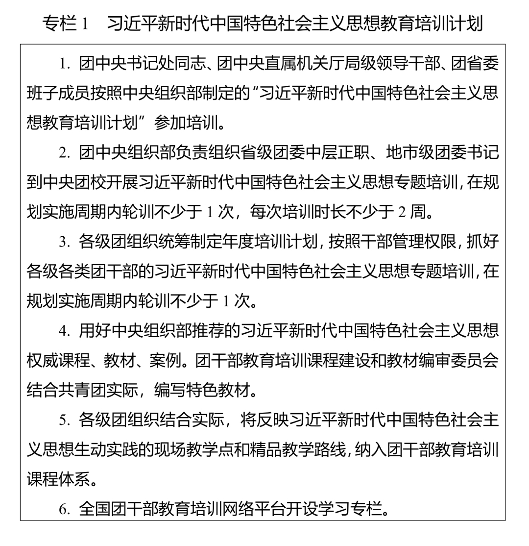 (一)聚焦聚力,久久为功。完善团干部理论教育培训长效机制,落实党的创新理论学习教育计划,组织实施习近平新时代中国特色社会主义思想教育培训计划(专栏1),系统谋划、持续用力,不断把思想铸魂、理论武装工作引向深入。坚持把习近平新时代中国特色社会主义思想作为团的各级领导机关班子成员理论学习中心组学习首要内容,作出具体安排、精心组织实施;作为各级团干部教育培训机构的主课必修课,办好理论进修班、理论研修班;作为团干部学习的中心内容,全面系统学、持续深入学、联系实际学。以县处级及以上团干部为重点,开展习近平新时代中国特色社会主义思想和党的二十大精神集中轮训;深入开展主题教育,通过专题学习、研讨交流、主题党课、调查研究、建章立制等形式,推动党的创新理论学习教育走深走实走心,使广大团干部更加深刻领悟“两个确立”的决定性意义,更加自觉增强“四个意识”、坚定“四个自信”、做到“两个维护”。深入开展习近平总书记关于青年工作的重要思想学习培训,使广大团干部学习掌握党的青年工作的地位作用、目标任务、职责使命、实践要求,为做好新时代新征程党的青年工作打牢思想基础。