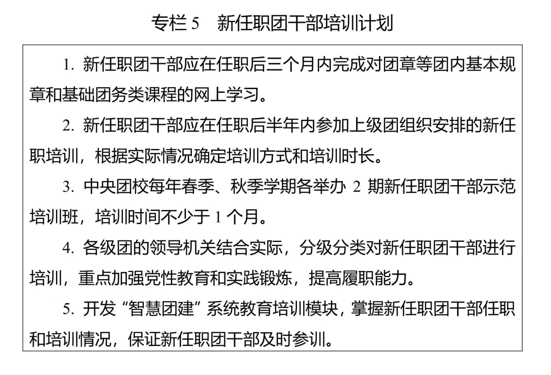 新一轮《规划》坚持把习近平新时代中国特色社会主义思想作为团干部教育培训的根本遵循和主题主线,深入贯彻习近平总书记关于党的建设的重要思想和习近平总书记关于青年工作的重要思想,聚焦提升团干部政治能力、理论素养、群众工作本领,系统谋划未来五年团干部教育培训工作。《规划》共8个部分、设置9个专栏,明确了团干部教育培训的总体要求,对开展习近平新时代中国特色社会主义思想教育培训、加强政治训练和履职能力培训作出专门部署,对团干部教育培训资源建设、网络培训体系建设、教育培训改革创新深化和组织领导等方面作出部署安排。