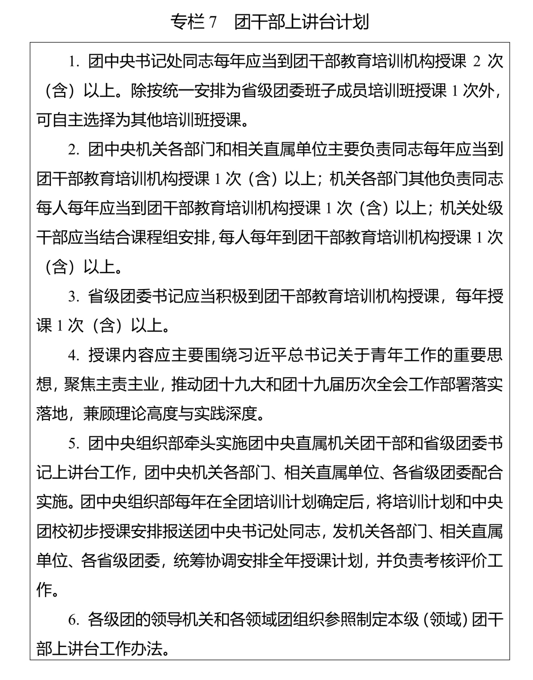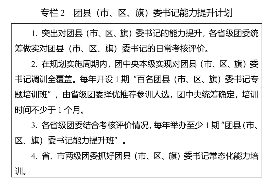 (二)突出“关键少数”政治训练。坚持把政治训练贯穿团干部成长全周期,使团干部的政治素养、政治能力与担负的领导职责相匹配。强化“一把手”政治培训,有计划地选调团的各级领导机关主要负责同志到团干部教育培训机构参加专题培训。强化对团县(市、区、旗)委书记这一群体的培训,实施团县(市、区、旗)委书记能力提升计划(专栏2)。突出对团的领导机关干部的政治训练,各级团的领导机关加强对机关干部的常态化政治能力培训。加强对青年人才的政治引领,团中央组织部会同有关单位每年组织一定数量青年人才开展国情研修。积极推动将地方团的领导机关班子成员培训纳入地方党委组织开展的干部政治理论培训范畴。