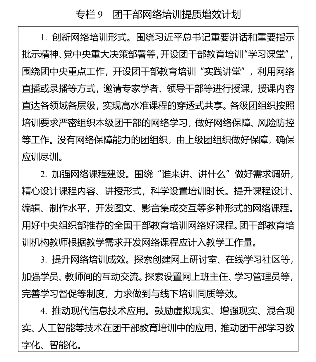 (二)加强网络培训课程建设。鼓励团干部教育培训机构开发精品网络课程。注重把握网络教学特点和规律,改进授课方式,提高制作水平,丰富呈现形式,提升课程质量。严把网络课程政治关、质量关,规范讲授、制作、审核、发布和更新、退出流程。充分发挥网络培训优势,推动优质资源下基层。用好网络直播培训形式,增强现场体验感。实施团干部网络培训提质增效计划(专栏9)。