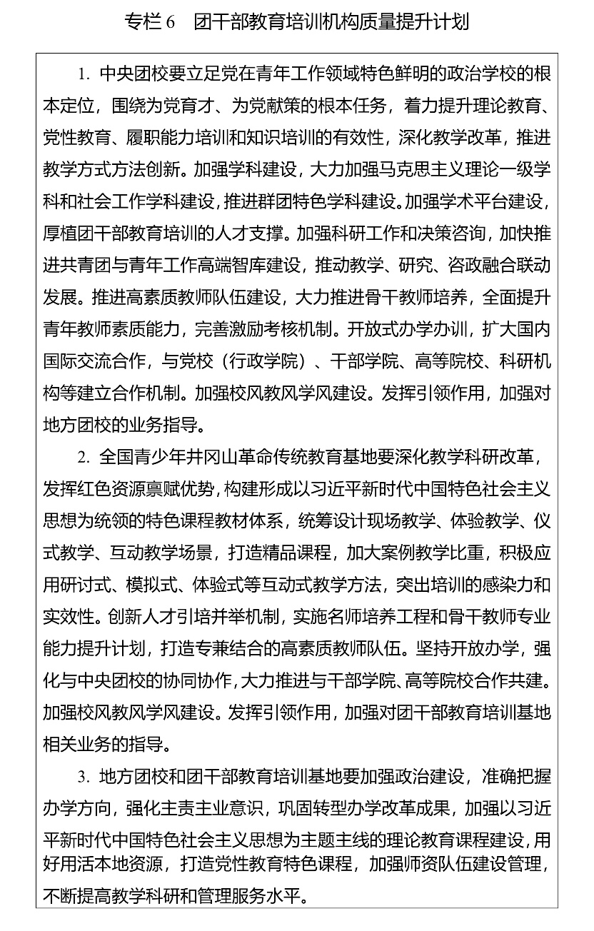 (一)培训机构建设。加强团干部教育培训机构规范管理和质量提升,推进各级团校、团干部教育培训基地建设,构建以中央团校、全国青少年井冈山革命传统教育基地为龙头,各级团校、团干部教育培训基地相互补充、布局合理、规范有序的培训机构体系,强化中央团校对地方团校的业务指导,不断提高办学水平。加强各类团干部教育培训机构规范管理,开展团干部教育培训机构办学质量评估。支持各地各级团组织联合开展培训,鼓励团干部教育培训机构开展区域协作交流,推动优质培训资源共建共享。实施团干部教育培训机构质量提升计划(专栏6)。
