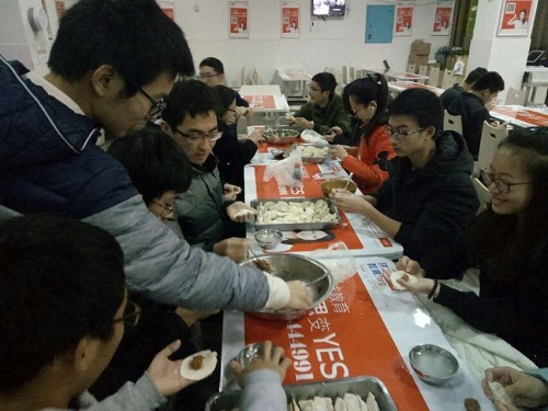 化工1601班同学借用学校食堂的设施;准备以亲手包饺子的形式来迎接圣诞节到的到来。其中共有韭菜鸡蛋,白菜猪肉及藕片猪肉等陷料。同学们自发分组,围在馅料旁开始了包饺子活动。这其中有高手同学,包出了标准的模范水饺;还有初试包饺子的同学包出了奇形水饺。而最终饺子形状更是多样。有正常型,三角型,人形,太阳型,包子型,甚至还有各种馅料包在一起的“饺王”水饺。
