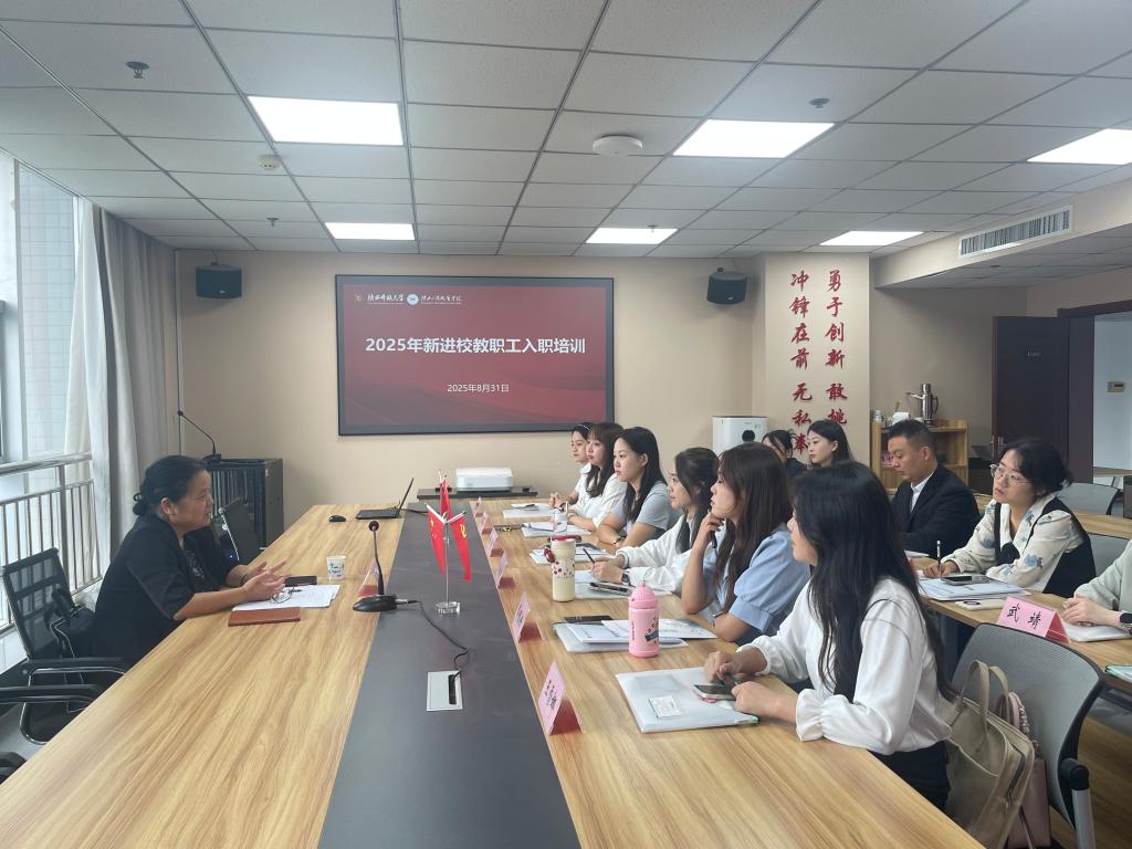 8月31日,学校2025年新进校教职工入职培训在综合楼1502会议室举行,校长吴宏梅出席讲授“入职第一课”并代表学校向大家表示热烈欢迎。