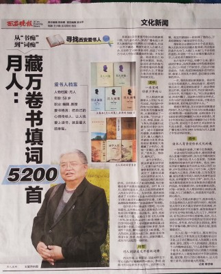 人物报道篇幅约2300字,开篇第二句即云当代著名词人、陕西广播电视大学月人教授家里也拥有近万册藏书。全文分为“读书——一本宋词俘获少年的心”、“用书——村人闲话启发创新词牌”、“传书——读书人有责任传承文化的魂”。