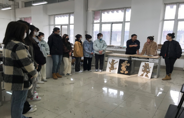 交流学习活动在热烈的气氛中展开。西安建筑科技大学艺术学院和西安美术学院工艺艺术系教师对学生作品进行了精准分析和点评,指出急需改进的问题。针对“综合材料装饰画设计”主题,校外教师介绍了装饰画设计新技法、新理念,并就如何感知材料、如何运用材料回答学生提问。之后,师生进行了自由讨论,同学间对设计作品纷纷发表自己的见解,表达自己对装饰设计的思路和看法。
