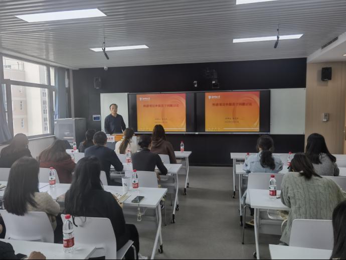 活动中,杨立军以“科研项目申报若干问题讨论”为题,结合自己多年的工作经历,详细介绍了科研项目的基本常识、科研项目的特点、科研项目申报等内容,并从如何选题、填写申报书等方面给予青年教师们精准的指导。