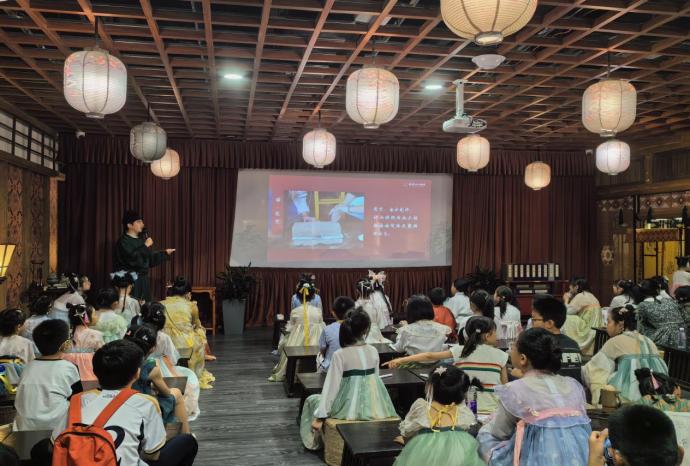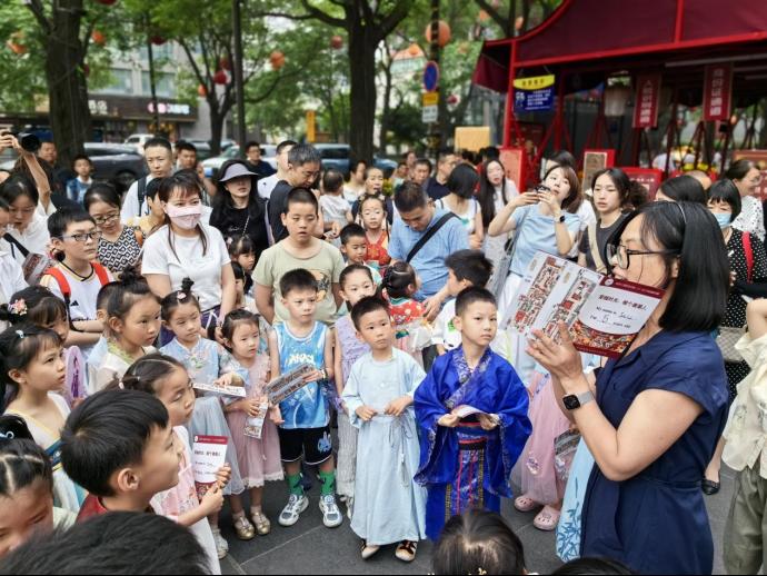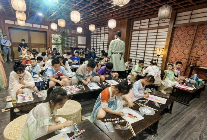 本次活动以“一步入唐,做一天唐‘潮’人”为主题,在进入主题街区前,每个小朋友手里拿着旅游与酒店管理学院为大家准备的“六一亲子双语研学手册”,听着王红丽、吴珊珊两位老师及两位研学小先生用中英文双语就“日晷”“叉手礼”“折柳送别”等故事及非物质文化遗产--西安鼓乐做的精彩有趣的讲解。一双双专注而欢乐的眼神期待着做一次见证传承的神秘时光旅人。进入主题街区后唐朝开市、百官迎宾、霓裳羽衣舞,盛世大唐跃然眼前,全唐沉浸的氛围下,感受到千年前长安古城的繁华与魅力;活动还特别为6岁以上小朋友设置了非物质文化遗产皮影的手工制作环节,通过文化大史的深度讲解,认识皮影人物,孩子们亲手制作,提高动手能力,感受非遗文化魅力;随后家长带着孩子继续学习感受唐长安城规划布局特点,感知唐代市井生活和社会风貌。