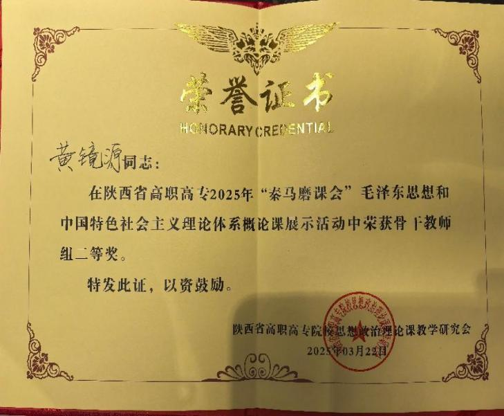 该课程教学展示活动是陕西省高职高专2025年“秦马磨课会”的首场活动,也是“毛泽东思想和中国特色社会主义理论体系概论”课程专场现场展示活动,共有36位教师分别获得“青年组”和“骨干组”磨课活动一、二、三等奖。学校教师黄镜源获“骨干组”二等奖,教师罗慧莹获“青年组”三等奖。