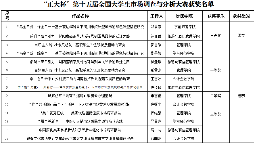 近日,由中国商业统计学会主办的“正大杯”第十五届全国大学生市场调查与分析大赛结果公布,学校共获得专科组一等奖5项、二等奖1项、三等奖5项;三支团队晋级全国决赛,并获三等奖。