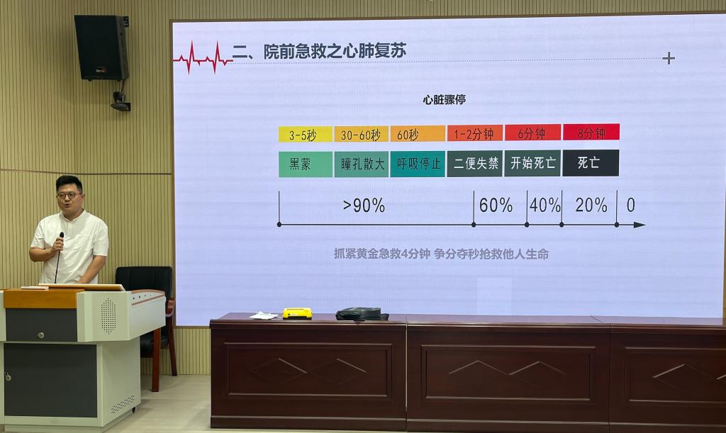刘剑飞医生以近期突发急救案例为切入点,运用通俗易懂的语言,结合临床经验,讲解了急救的基本原则、心肺复苏操作流程、气道异物梗阻急救方法等知识。他还提醒同学们,在遇到突发情况时,保持冷静是实施有效急救的关键。在AED(自动体外除颤器)使用教学环节,刘剑飞医生通过现场演示和视频播放相结合的方式,详细介绍了AED的适用情况、操作步骤及注意事项。