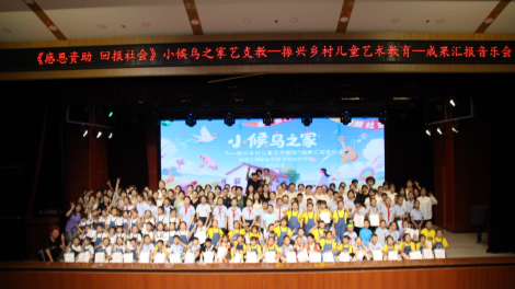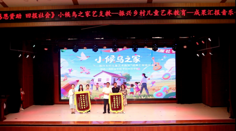 学前师范学院受助学生以专业所长反哺社会,通过“小候鸟之家”艺支教项目,累计为乡村小学、幼儿园输送美术、音乐、舞蹈等课程超百课时。受助王莽街道汤房庙小学杨校长和汤房庙幼儿园园长向学院赠送锦旗,致谢“艺术之窗照亮乡村未来”。