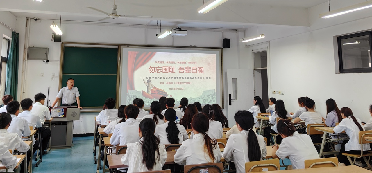 为纪念中国人民抗日战争暨世界反法西斯战争胜利八十周年,6月30日下午,会计金融学院举办《勿忘国耻,吾辈自强》专题党课讲授活动,马克思主义学院党总支副书记张伟波主讲。