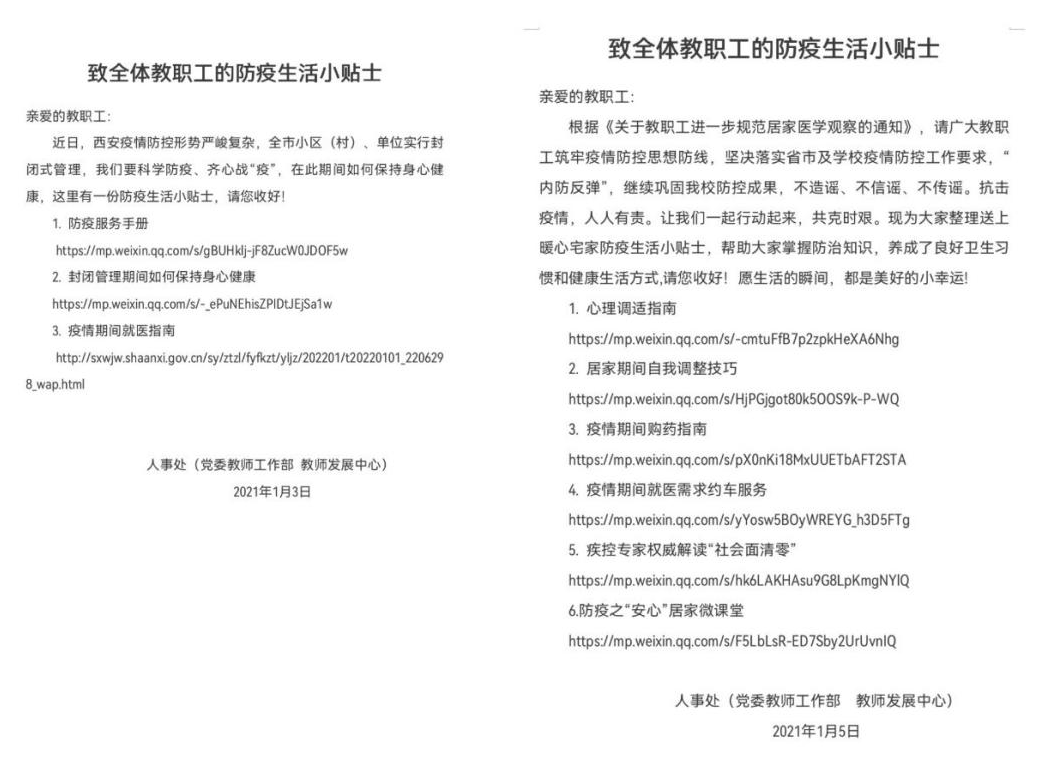 汇编《致全体教职工的防疫生活小贴士》,将最新的疫情防疫知识、疫情期间生活指导等内容发送给教职工,引导广大教职工落实省市及学校疫情防控的规定和要求,坚决做到不信谣、不传谣、不造谣。