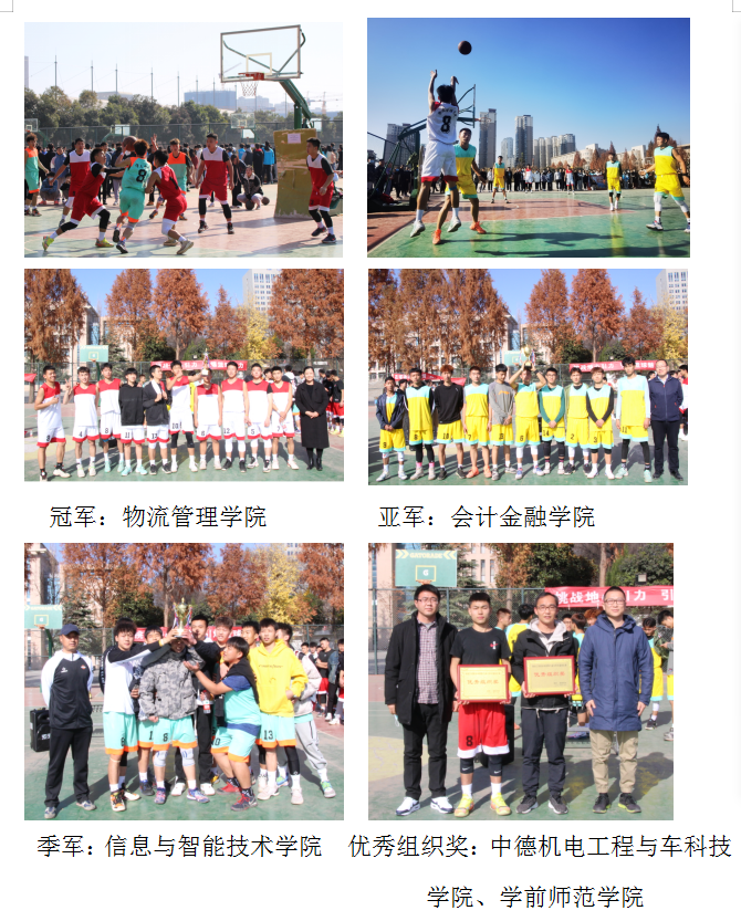 本届比赛共有9支代表队参赛,经过为期四周的角逐,物流管理学院获冠军、会计金融学院获亚军、信息与智能技术学院获季军,18名同学获得优秀球员荣誉称号;中德机电工程与汽车科技学院、学前师范学院获优秀组织奖。