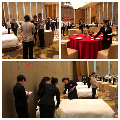 西安人民大厦索菲特酒店代表队、西安皇冠假日酒店代表队、智选假日酒店代表队和金信餐饮公司代表队的36名选手分别组队参赛。本次比赛设四个赛项,其中杜建华、冯雅力担任以“温馨家园”为主题的中式铺床赛项主裁判,万苗苗担任中西餐摆台赛项主裁判。