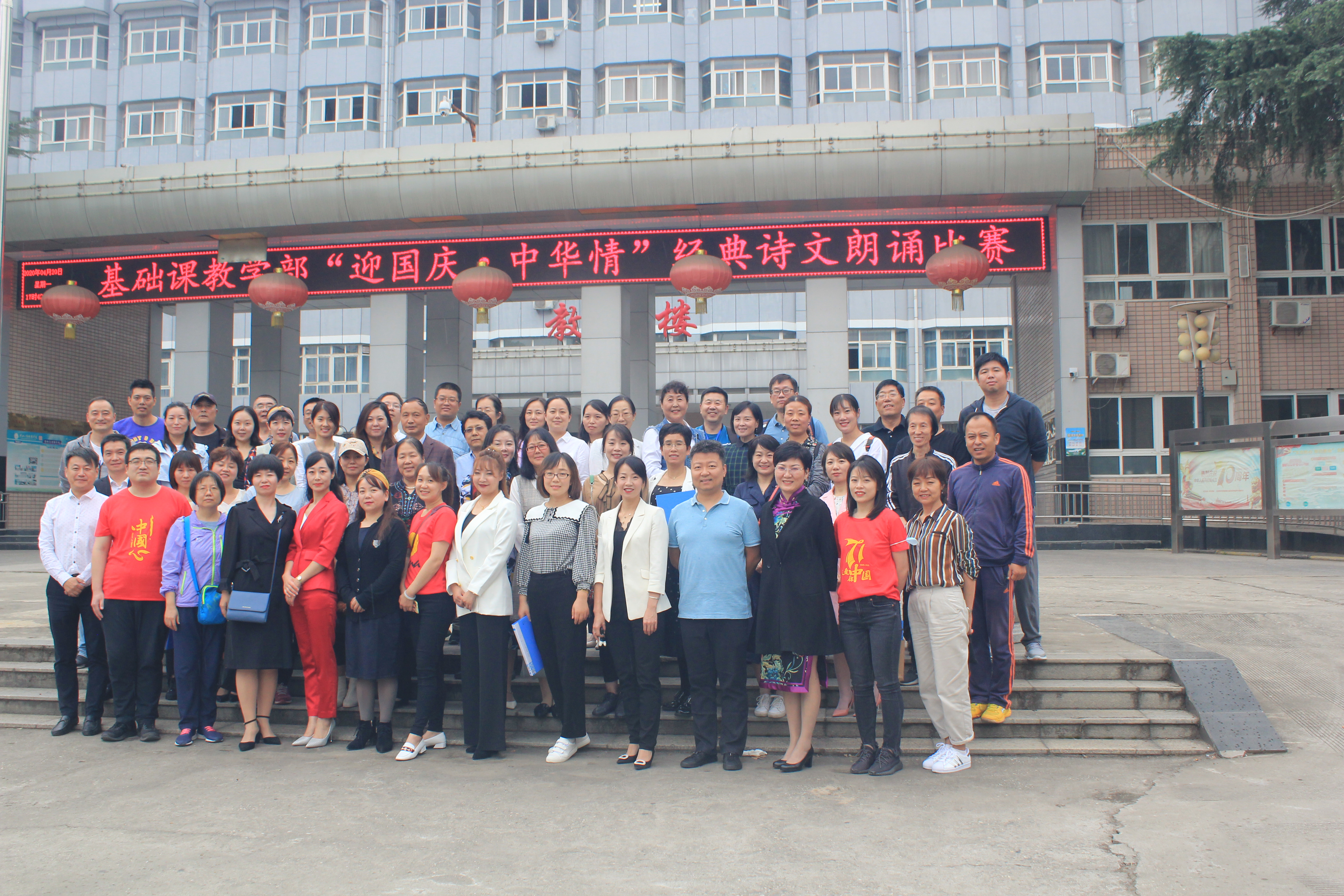 为庆祝中华人民共和国成立71周年,积极推进第23届全国普通话宣传周活动,不断激发全体教师爱国情感,提升经典诗文诵读水平,9月30日下午,基础课教学部在太白校区报告厅举办了“迎国庆·中华情——我与经典有约”诗文朗诵比赛,基础课教学部全体教职工参加了本次活动。经过前期精心准备,共有12组教师选手进入了决赛。