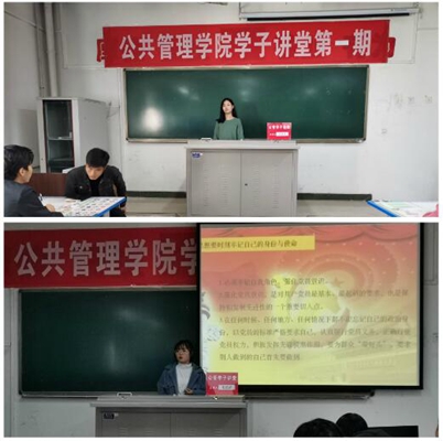 ——公共管理学院学子讲堂。9月25日、10月16日,公共管理学院学子讲堂第1、2期在郭杜校区教学楼北315教室举行,分别由2016级物业管理专业毕业生卫思柔和人力资源管理专业毕业生毛延清为党支部预备党员和积极分子分享学习心得《大学生的初心和使命》《做一名合格的共产党员》。