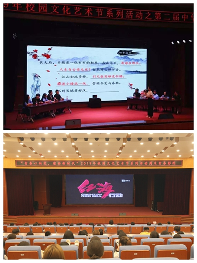 校园文化艺术节以“青春心向党,建功新时代”为主题,共开展了“纪念五四运动100周年”五四爱国主义宣传教育活动、2019年大学生足球比赛、2019年学生书画摄影比赛、第二届中华诗词大会、周末青春影院、“青春心向党,建功新时代”主题文艺晚会、“浓情端午,青春有梦”传统文化展演等七项活动,共计6000余人次参与。从思想引领、爱国教育、文化传承、艺术熏陶、体育竞技、传统节日教育等方面对全校学生进行了全面的素质提升教育。