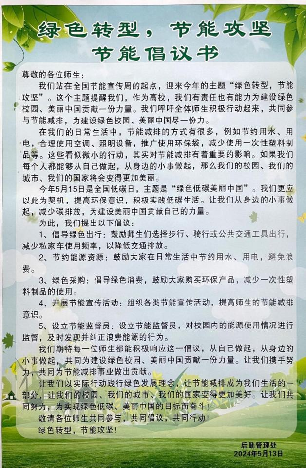 5月13日至19日是我国第32个全国节能宣传周,为落实全面节约战略,传播绿色发展理念。近期,学校后勤管理处围绕着“绿色转型,节能攻坚”“绿色低碳,美丽中国”的主题,通过发放倡议书和张贴海报宣传等形式,倡导全校师生在节能宣传周期间少开一小时空调、少用一张纸,在日常生活工作中节约用电、节约用水、多乘公交车、多骑自行车、步行上下班、低碳出行,向全体师生宣传节能理念,推广节能方法,增强大家的节能意识。
