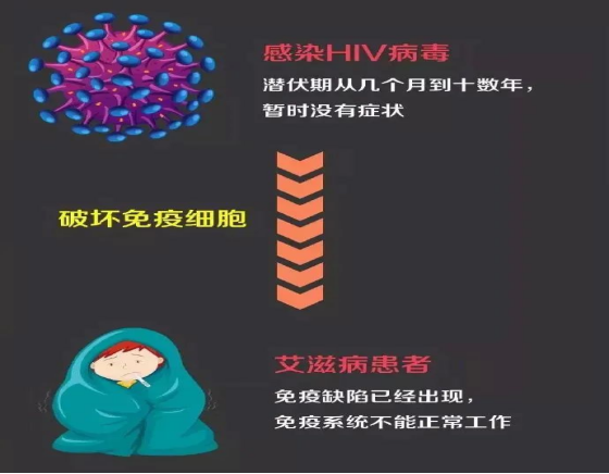 2.艾滋病病人:发病阶段,被感染者体内的病毒增长到一定的数量的,免疫功能也被破坏到一定程度,其他病菌乘虚进入人体,使其发生多种疾病,如严重的腹泻、肺炎、多种癌症,还可以使人痴呆,这时的病人即称为艾滋病病人。艾滋病病人往往死于由这些疾病造成的身体衰竭。