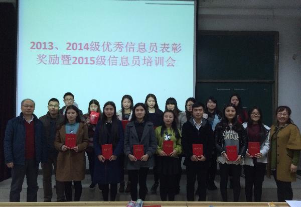 级新聘学生教学信息员进行了业务培训,组织他们学习了信息员工作职责及聘任管理办法,安排了有关工作任务,同时为每名信息员颁发了聘书。