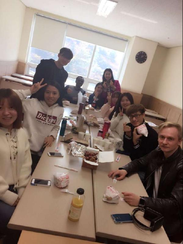 接下来说说生活吧。特别在语言班,生活真的很精彩 ,来这里之后,学校会委派一个帮助你日常生活的韩国人,几个中国人和一个韩国人一组,定时聚会,一起去玩,还有语言班也会组织好多活动,和好多外国人交流。我们班有德国留学交换到韩国的俄罗斯人,他非常喜欢我,虽然交流不多(我英语超烂),但是我喜欢他的个性,西方人我行我素的感觉确实很有魅力,还有一个黑人49岁了,不敢想象吧。还有一个巴基斯坦人,很活泼,其余的是有来自台湾和中国内地的学生了。我们相处的都很融洽,老师非常和蔼,我们一起吃零食,喝咖啡,开玩笑,上课的氛围非常愉快和谐。